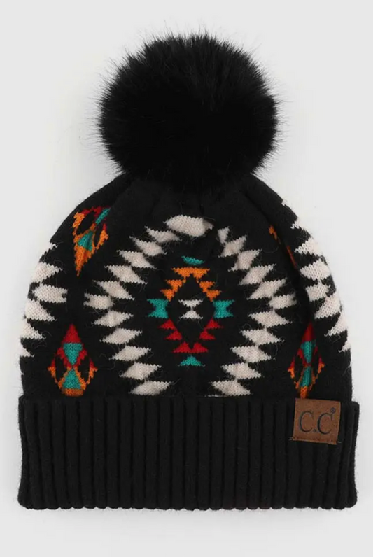 C.C. Soft Aztec Pattern Beanie with Faux Fur Pom